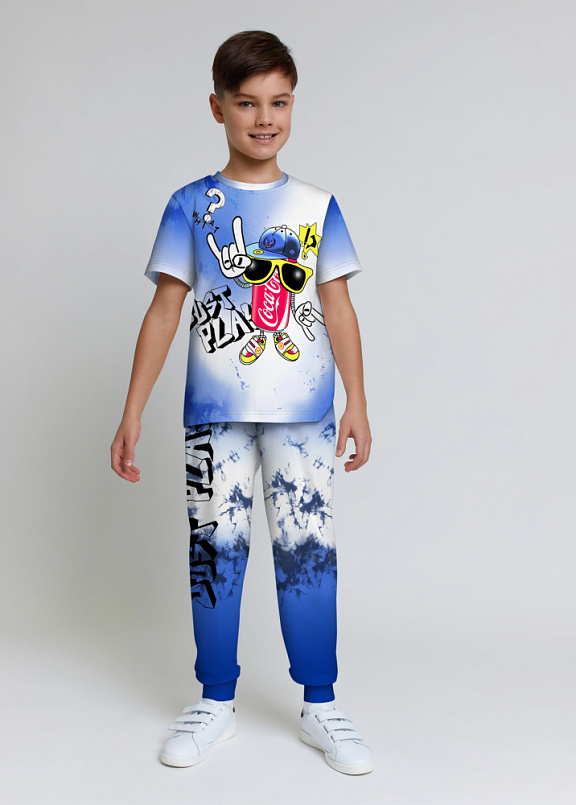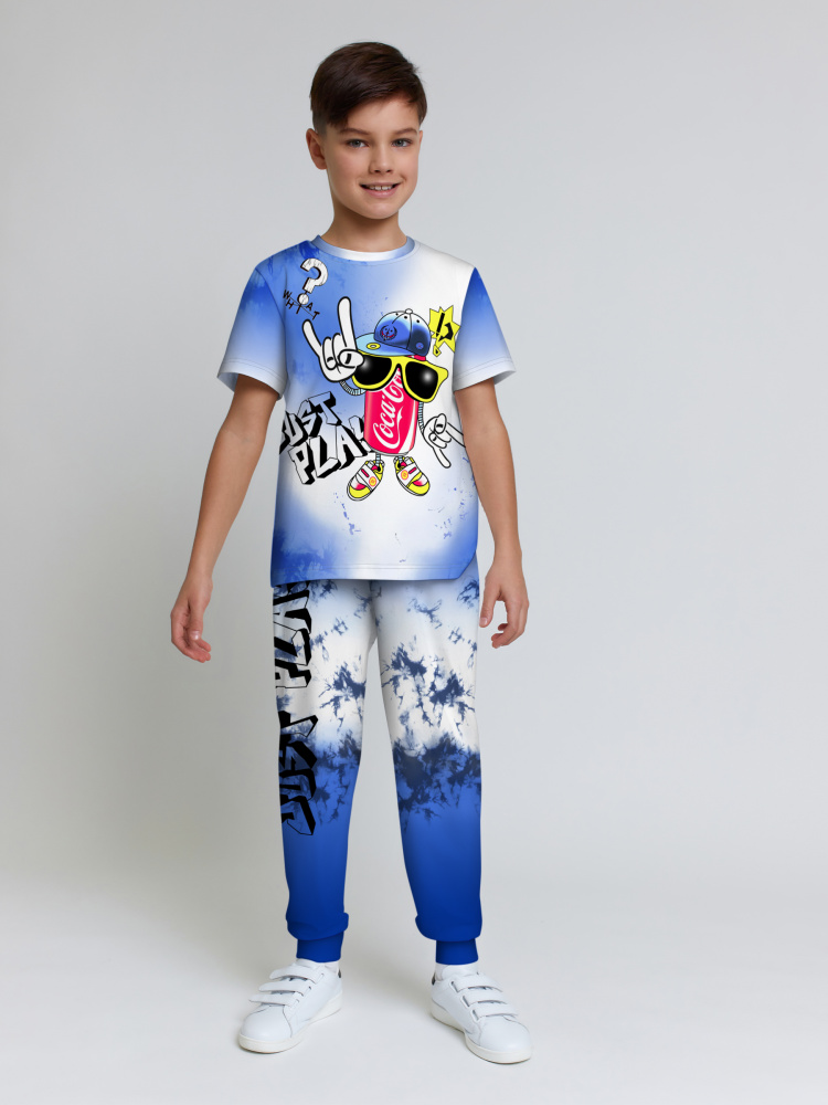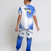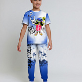 Стильная пижама c ярким тематическим принтом из хлопка. Комплект состоит из футболки прямого силуэта и брюк с манжетой. Пижама идеальна для сна, отдыха или прогулок. Футболку от пижамы можно использовать как самостоятельную деталь гардероба. Мягкий хлопок с бархатистым эффектом обладает приятными тактильными свойствами, а яркий принт не ощущается на ощупь. Все используемые краски для печати принта безопасные и экологичные.