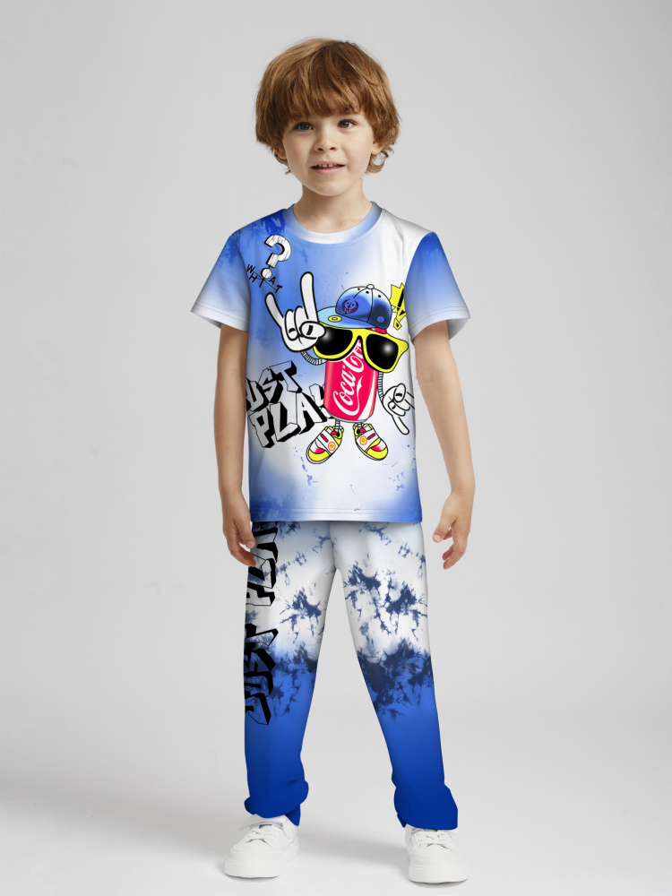 Стильная пижама c ярким тематическим принтом из хлопка. Комплект состоит из футболки прямого силуэта и брюк с манжетой. Пижама идеальна для сна, отдыха или прогулок. Футболку от пижамы можно использовать как самостоятельную деталь гардероба. Мягкий хлопок с бархатистым эффектом обладает приятными тактильными свойствами, а яркий принт не ощущается на ощупь. Все используемые краски для печати принта безопасные и экологичные.