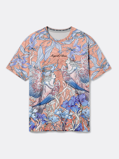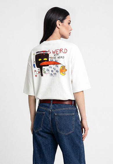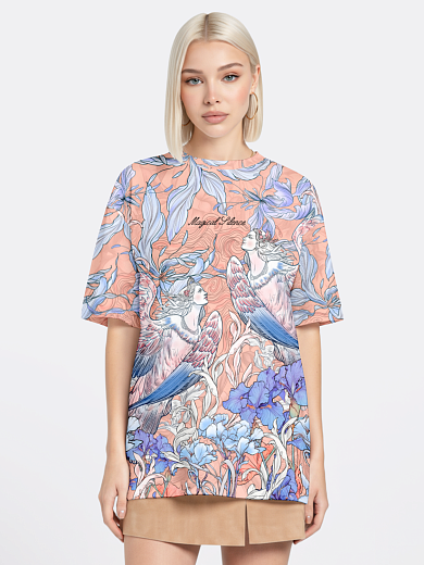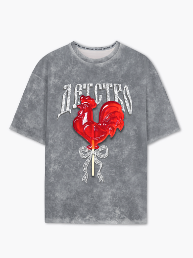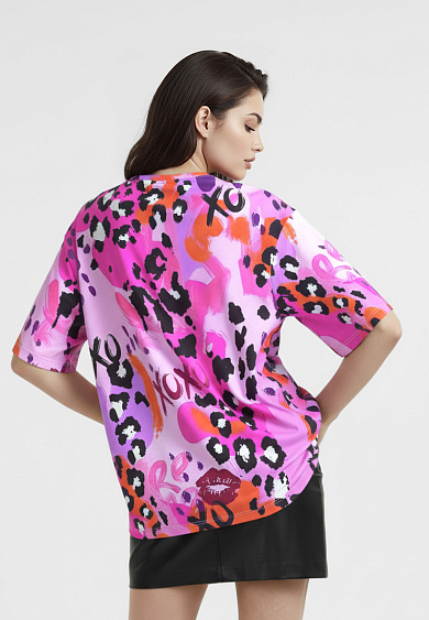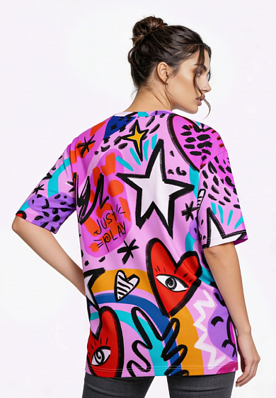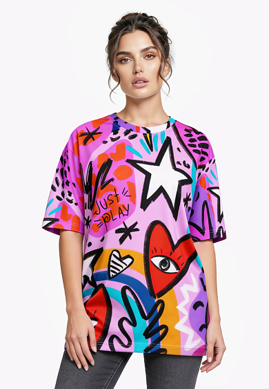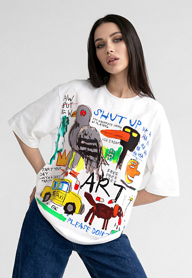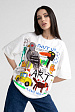 Стильная футболка с ярким тематическим принтом из хлопка. Футболка оверсайз с коротким рукавом. Мягкий хлопок обладает приятными тактильными свойствами, а яркий принт совершенно не ощутим, благодаря уникальной технологии печати по ткани. Все используемые краски для печати принта безопасные и экологичные и позволяют ткани дышать.