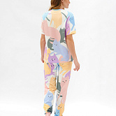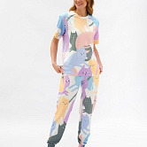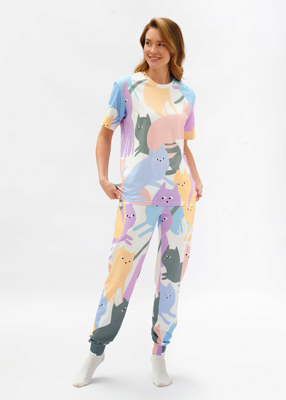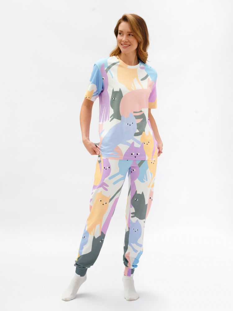 Стильный комплект c ярким тематическим принтом из хлопка. Состоит из футболки прямого силуэта и брюк с манжетой. Комплект можно использовать как домашний костюм или пижаму. Мягкий хлопок обладает приятными тактильными свойствами, а яркий принт совершенно не ощутим, благодаря уникальной технологии печати по ткани. Все используемые краски для печати принта безопасные и экологичные и позволяют ткани дышать.